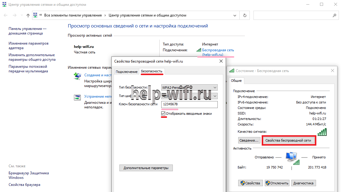 Щелкните по значку Wi-Fi левой кнопкой мыши и выберите пункт «Параметры сети и Интернет». В новом окне перейдите в «Центр управления сетями и общим доступом». Нажмите на название беспроводной сети, вы попадете в меню настроек. Далее нужно нажать на кнопку «Свойства беспроводной сети» и выбрать вкладку «Безопасность». Здесь поставьте галочку в отображение символов, вместо точек появится ваш пароль.