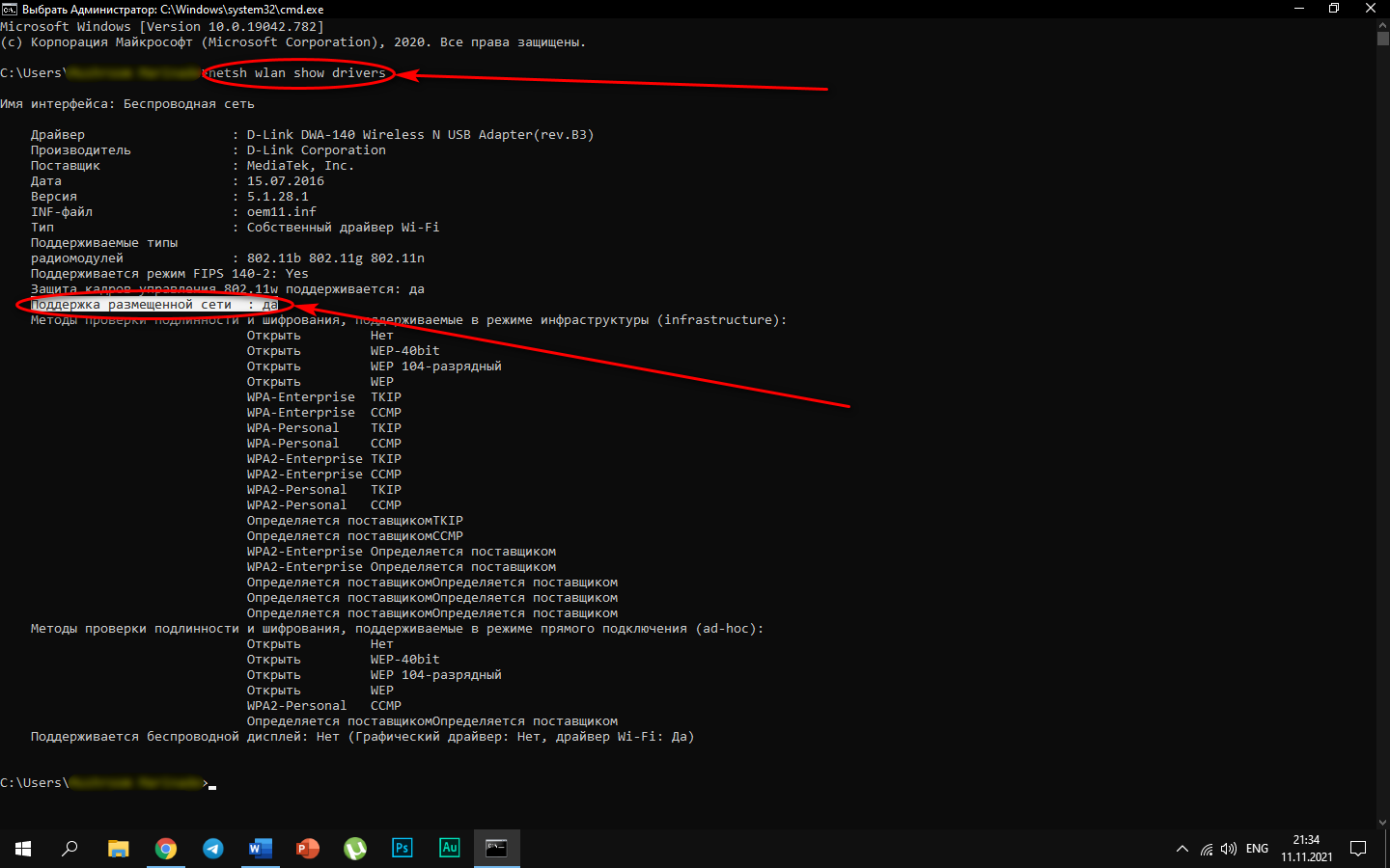 Далее нужно найти ответ на вопрос — установлено ли значение «Да» в строчке «Поддержка размещенной сети». Если ответ «Нет», то драйвер нужно установить, а затем произвести проверку вновь.