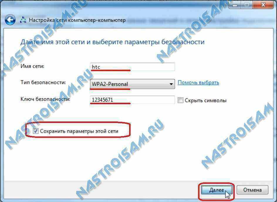 Теперь надо ввести параметры создаваемой беспроводной сети Вай-Фай: «Имя сети» или идентификатор SSID; «Тип безопасности» лучше оставить по умолчанию — WPA2-Personal. В поле «Ключ безопасности» — вводим так называемый пароль на WiFi — буквенная, цифирная или смешанная последовательность не короче 8 символов. Ставим галочку «Сохранить параметры этой сети». Нажимаем кнопку Далее.