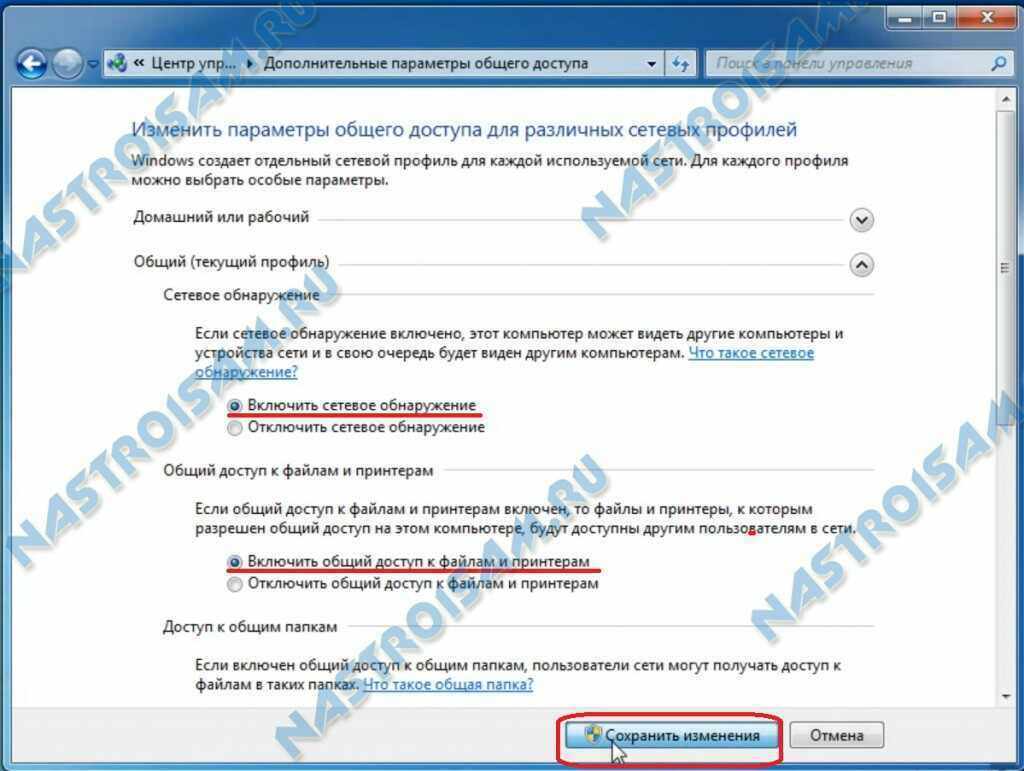 Если вы хотите, чтобы подключенные устройства видели в сети открытые папки и сетевые принтеры на этом компьютере или ноутбуке — ставим галочки «Включить сетевое обнаружение» и «Включить общий доступ к файлам и принтерам». После этого надо нажать кнопку «Сохранить изменения».