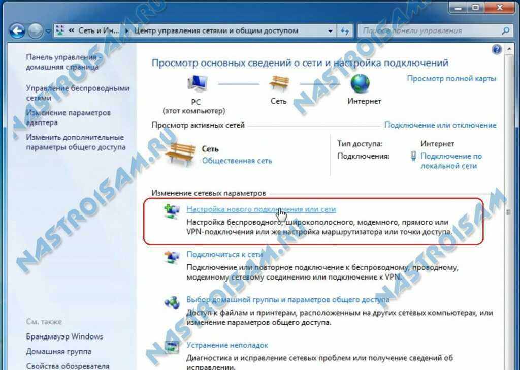 В открывшемся меню выбираем пункт «Центр управления сетями и общим доступом». Далее надо найти раздел «Настройка нового подключения».