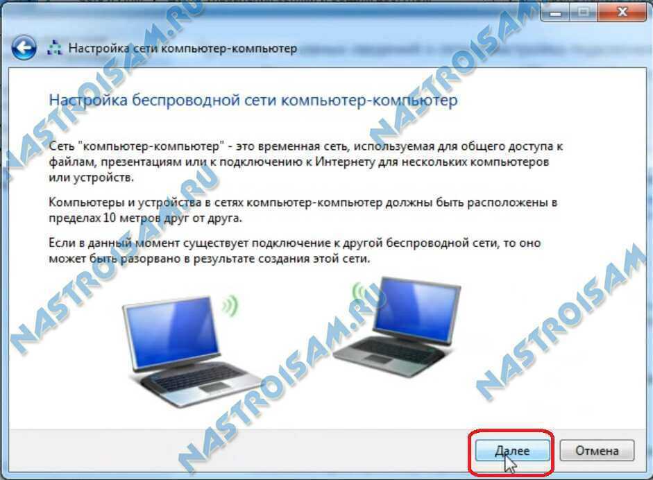 В нем надо выбрать пункт «Настройка беспроводной сети компьютер-компьютер» и нажать кнопку Далее.