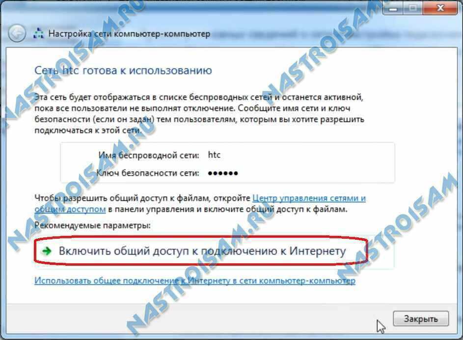 Всё готово и можно подключать планшет или смартфон. Но Вам нужно дополнительно включить и настроить общий доступ. Для этого кликаем мышью на кнопку «Включить общий доступ к подключению к Интернету».