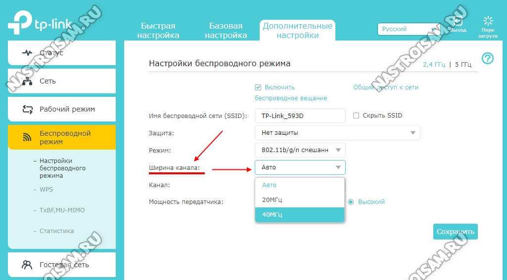 В правой части окна для нужного диапазона найдите строчку «Ширина канала» и выберите там значение 20 или 40 МГц. Нажмите кнопку «Сохранить».