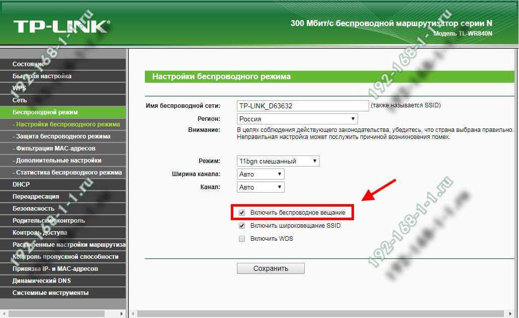 Если такой кнопки нет. тогда необходимо зайти в настройки маршрутизатора через веб-браузер (используя его IP — 192.168.1.1 или 192.168.0.1) и в основных параметрах настройки беспроводной сети найти пункт «Включить беспроводное вещание» (Enable Wireless, Enable Radio или т.п.):