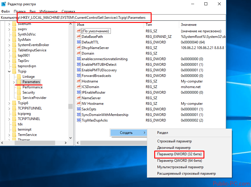 Обратите внимание, что на домашней версии «десятки» такие настройки вряд ли возможны. В разделе Parameters создаем новый параметр – DWORD (32 бита)
